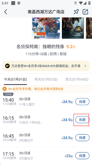 2、选择影城后,在下方的电影列表中,找到自己想看的电影并进入。可以根据自己的需求选择合适的场次,一般上午早一点的场次会很便宜。