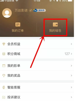 3、如果长期在万达观影,可以选择开通万达的会员“至尊卡”,开通后可以享受到折扣价格。可以点击下方的“我的”,点击“我的钱包”,并选择会员卡中的购买会员卡。