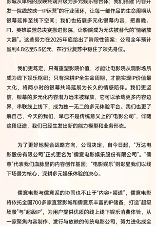 4月19日,万达电影发布公告,宣布正式更名为儒意电影娱乐股份有限公司。4月20日起,公司证券简称变更为“儒意电影”,证券代码“002739”保持不变。20日上午,儒意电影董事长兼总裁陈祉希发布内部信,解释了此次更名的深层次含义:公司更名成儒意电影,是为了更好地契合战略发展方向,“儒意”代表血脉里的内容创作基因;“电影娱乐”彰显以线下场景为核心、深耕多元娱乐体验的决心。