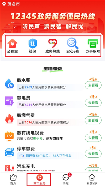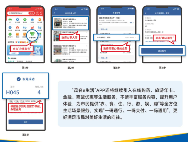“茂名e生活”APP是茂名市政府主导建设的智慧城市生活服务APP,涵盖政务服务、公共服务和生活服务,APP以“慧民生活每一天”为标准,为市民提供办事取号、公积金查询、政务热线、图书馆等服务。