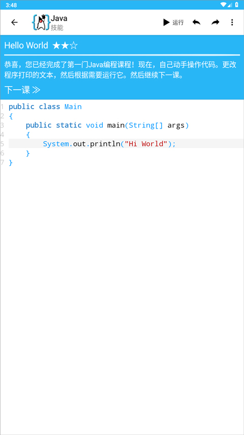 5、如没有报错,即可结束第一门Java编程课程,后面还有更加详细的Java技能学习。