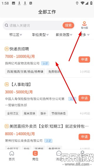 2.在岗位列表页,既可点岗位名看详情,也能点“看地图”切换到地图模式。