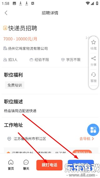 3.招聘详情界面能瞧职位福利和描述,点“拨打电话”或“申请职位”可沟通。