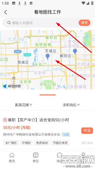 4.进入地图找工作界面,在顶部搜索框输入关键词,按位置筛选岗位。
