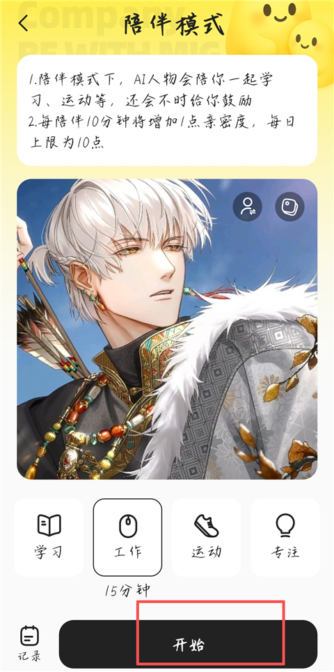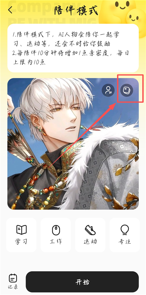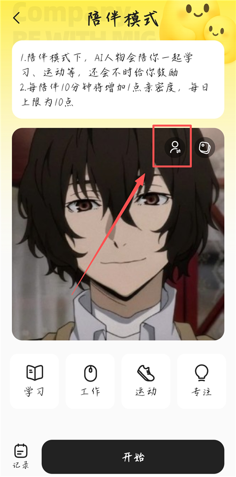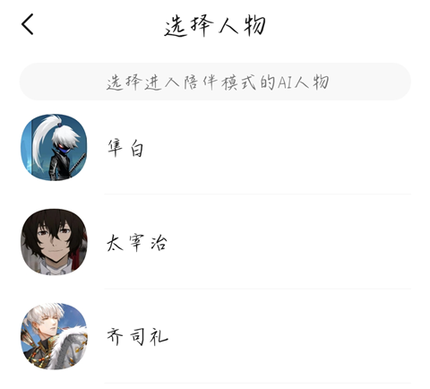 2、点击人物图标选择需要陪伴的AI角色。(注意仅限已经有过聊天的AI角色)