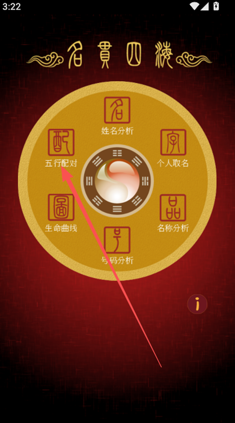 1、在本站免费下载安装该软件的官方版,打开进入,这里的八卦阵铜钱上有六个功能分别是姓名分析、个人取名、名称分析、号码分析、生命曲线和五行配对。