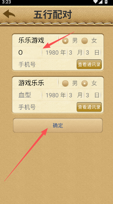 2、分别输入双方的姓名、性别、血型以及手机号码开始配对。