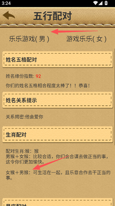 五行配对:在“五行配对”板块,可输入两个或多个姓名,系统会分析它们之间的五行相生相克关系,适用于姓名婚配或团队名称搭配等场景。