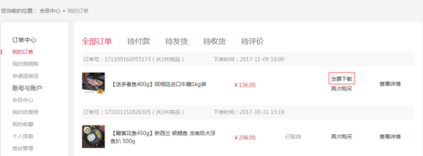 1、进入订单列表页面,找到对应订单,点击“发票下载”链接;