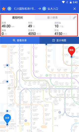 该APP提供中文搜索功能,用户只需在搜索框中输入目的地的中文地铁站名称(如“明洞”“弘大入口”等),即可快速获取地铁路线、换乘信息、所需时间及票价等详细数据。