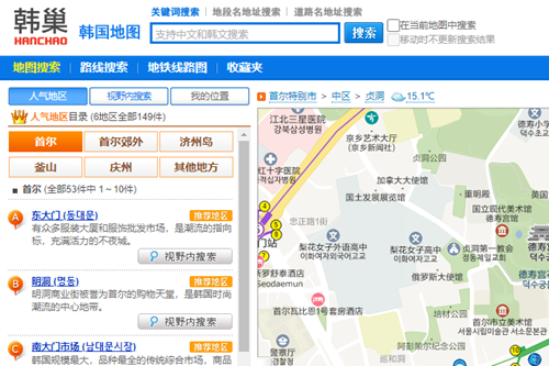 韩巢韩国地图是目前最全最细致的中文版韩国电子地图。作为来韩国自由行游客的最佳伴侣,它提供中文搜索功能,输入中文名即可查询准确的位置信息。来韩国之前,搜索好想去的地点并加入自己的收藏,来到韩国之后,只需要参考手机里的韩巢APP就可以,你的韩国之旅将会一路畅通。