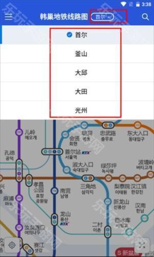 1、进入韩巢韩国地图app并找到点击下图红框处,可以切换城市查看不同城市的地图线路