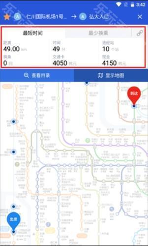 3、红框中可以查看到两地之间的距离,路程时间以及通勤费用
