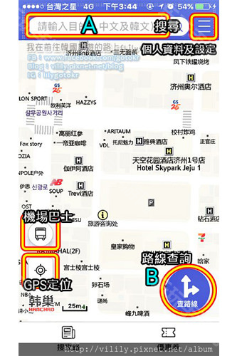 韩巢地图支持中文搜索和导航,可查询济州岛的景点、酒店、公交站点等位置信息,提供路线规划功能,包括步行、公交等出行方式的导航。