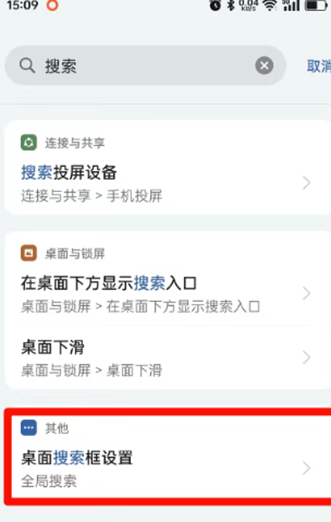 在桌面下滑唤出全局搜索框,点击右上角的设置图标(通常为齿轮或三个点)。