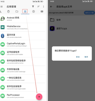 从手机存储中选择已下载的第三方APP的APK文件,点击“确定”开始安装。