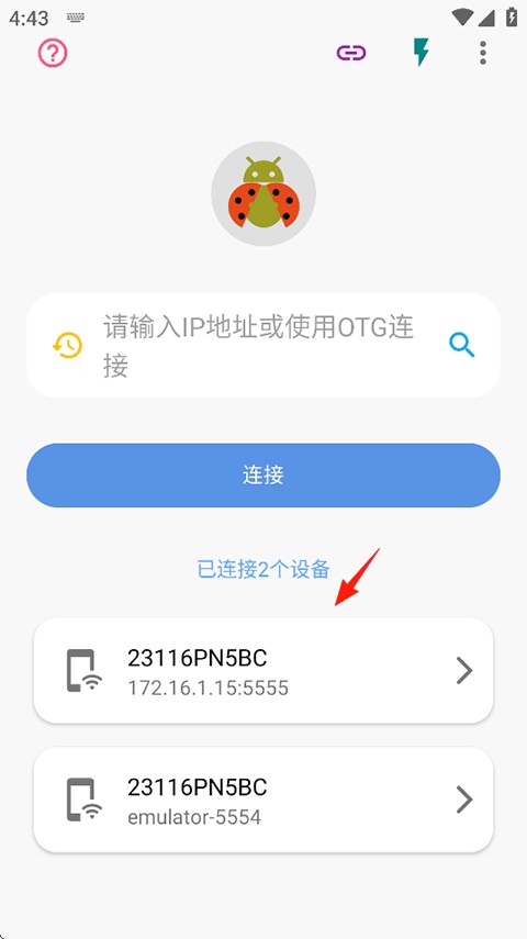 1、打开甲壳虫ADB,用户需要先输入IP地址或使用OTG连接设备,接着点击设备进入;