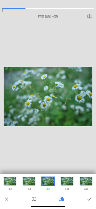 选择滤镜样式:左右滑动浏览18款预设(A/B/L/X四组),如:
