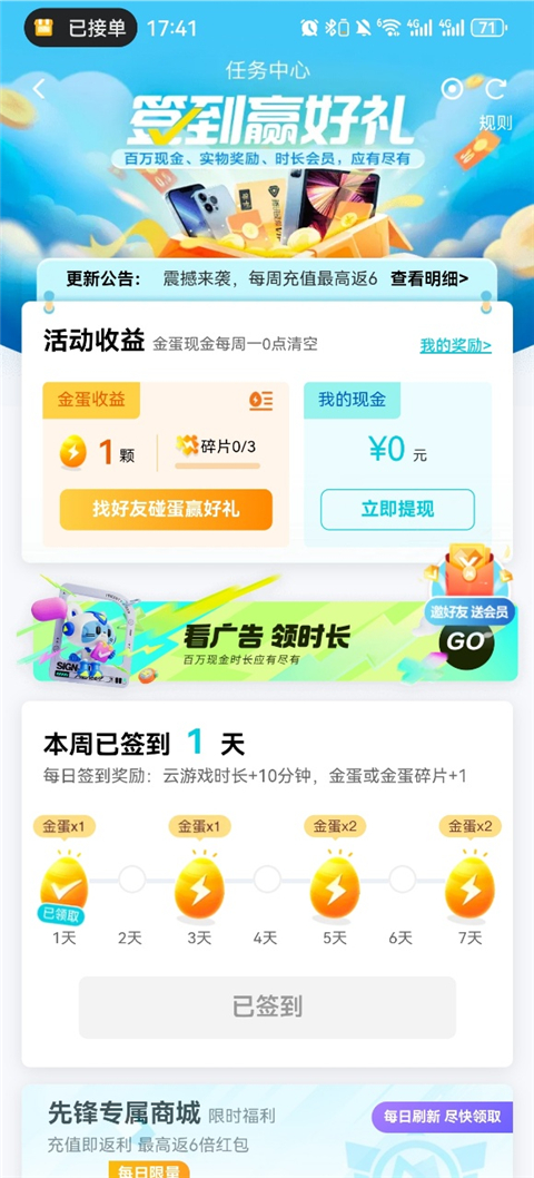 所有用户每日签到可领1小时免费时长(当日0点失效)。