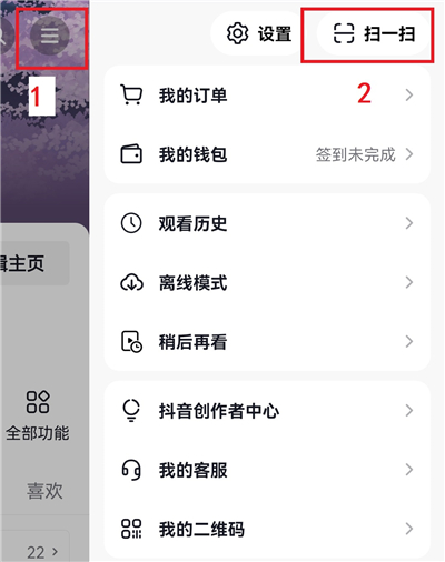 1、在个人主页点击三条横线的标识后,右边会出现页面,再点击最顶上的【扫一扫】。