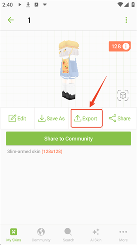 1、首先选择一个想要导入至游戏的皮肤,点击Export也就是导出。