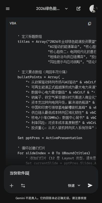 1、你可以让Gemini写一段VBA代码,直接在PowerPoint中运行生成幻灯片。
