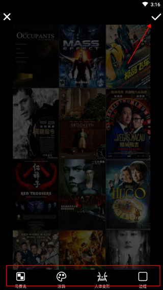 5、另外,点击主界面的实用工具,,可以对图片进行马赛克、涂鸦、人体变形、边框的添加,编辑完成后,可以点击右上角的√保存;