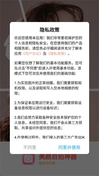 1、下载安装美颜自拍神器app仔细阅读隐私政策,点击同意并使用。