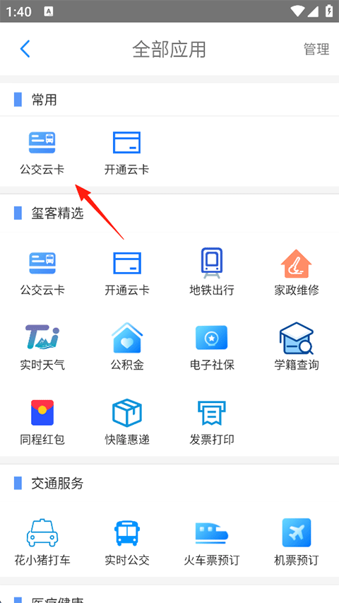 2、在全部应用页面囊括了公交云卡、地铁出行、家政维修、实时天气、公积金等众多服务功能,以公交云卡为例,点击进入;