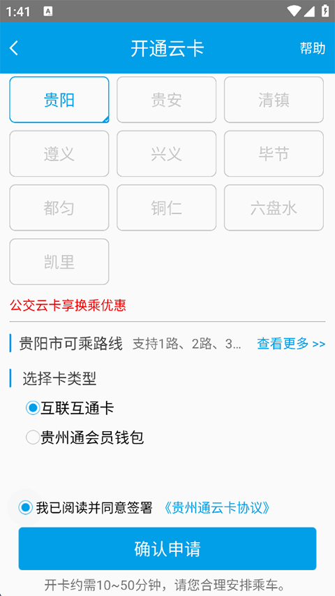 3、选择您所在的公交云卡开通城市,分为互惠互通卡和贵州通会员钱包,以互联互通卡为例,点击确认申请;