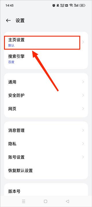 进入浏览器设置页面,点击【主页设置】。