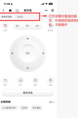 聚好看这个APP打开来后,你得绑定你的设备,比如说海信电视机,绑定后才能用聚好看来管理海信电视机。