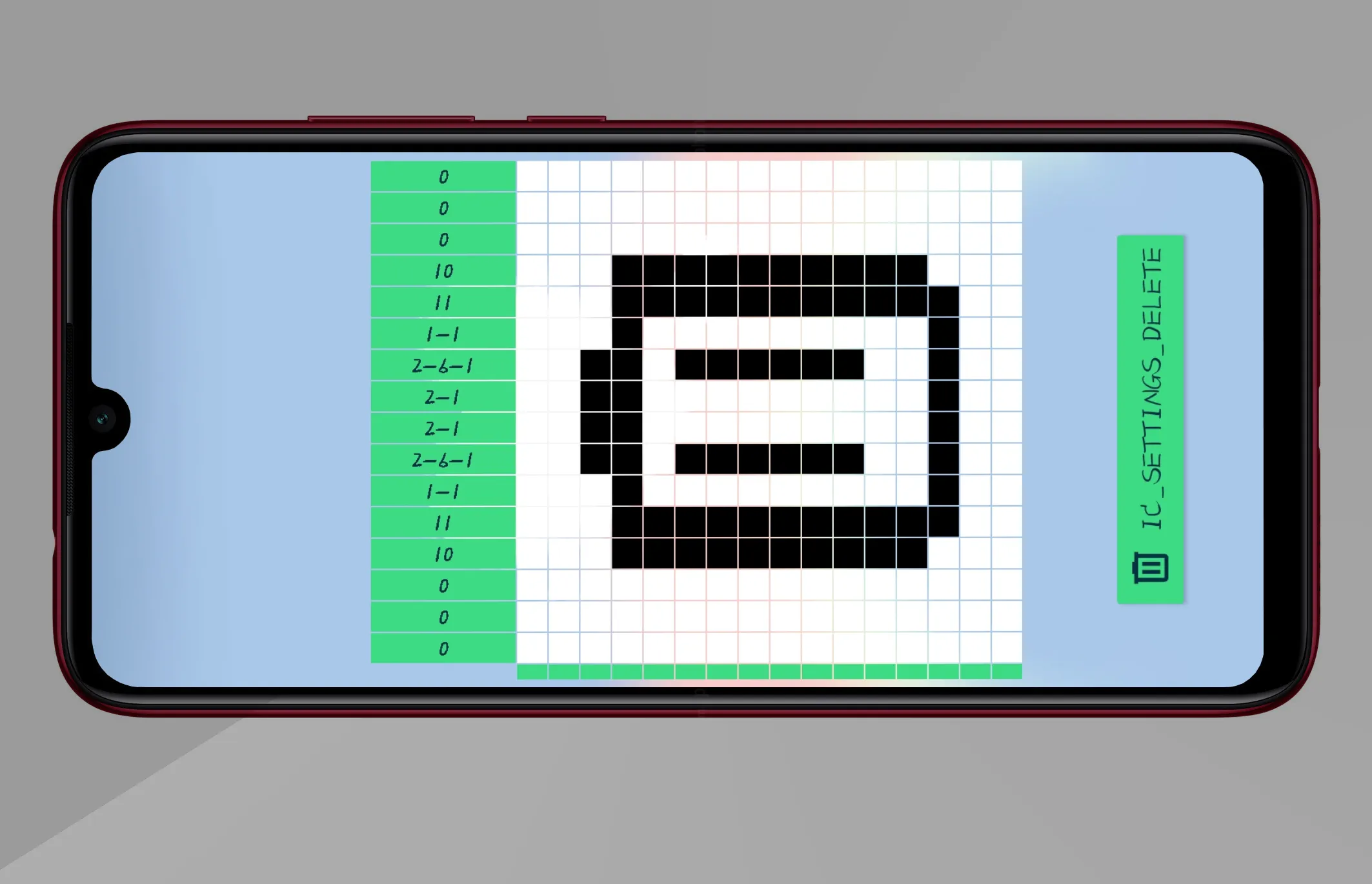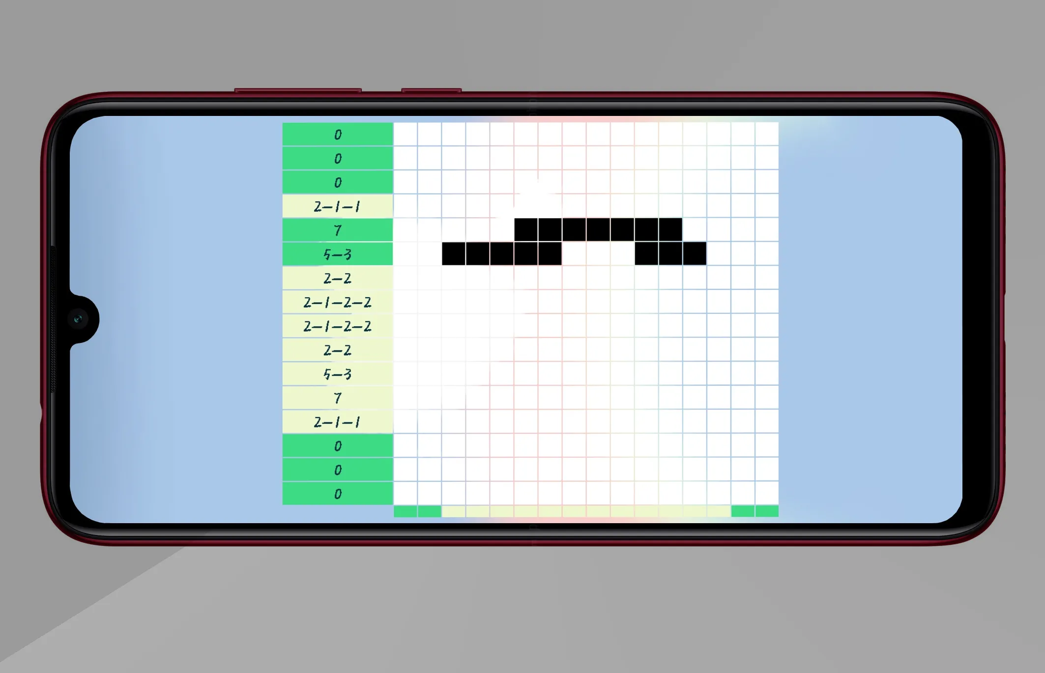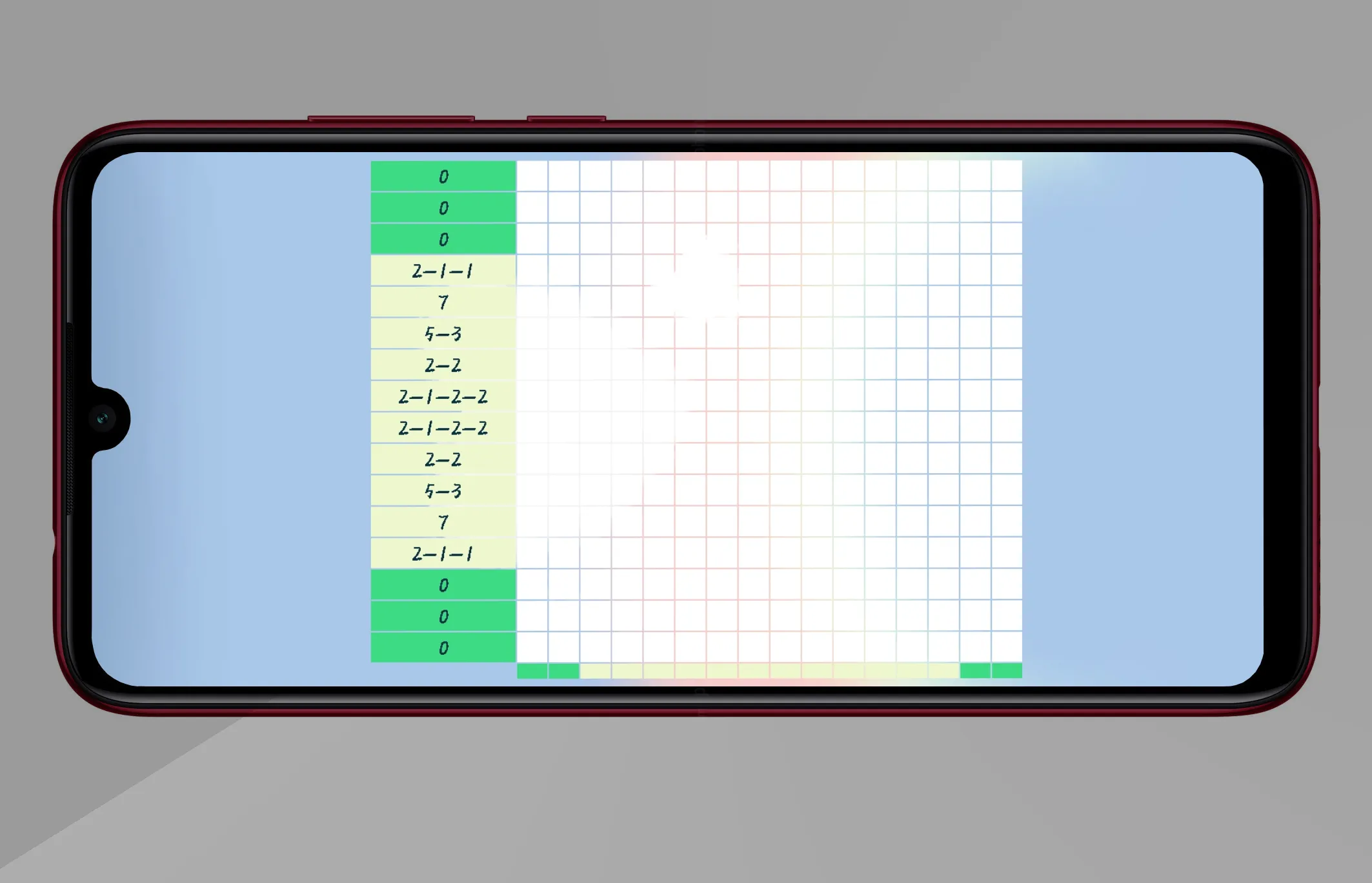 到了这个界面,是不是有点懵呢,只要最左边和最下面全部变成绿色即可完成图案。图中左边的数字说明该行有几个黑块,通过点击该行的方块,直到该行变成绿色即可。