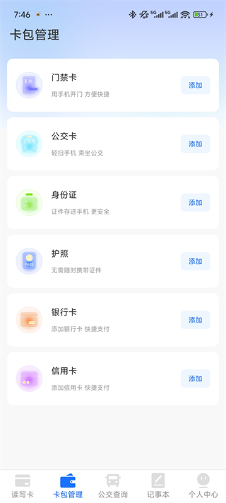 1、打开手机NFC App,在主页可以看到有很多功能【以公交卡为例添加】