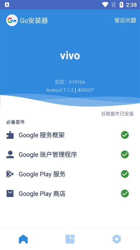 (2)打开Go谷歌安装器,主页面会显示手机型号和谷歌组件的安装情况,只需要点击 GO 按钮,等待程序自己完成安装即可。需要注意的是有些安卓系统会有提示,需要手动确认安装,注意弹出的窗口。