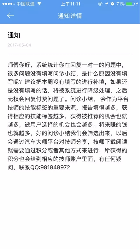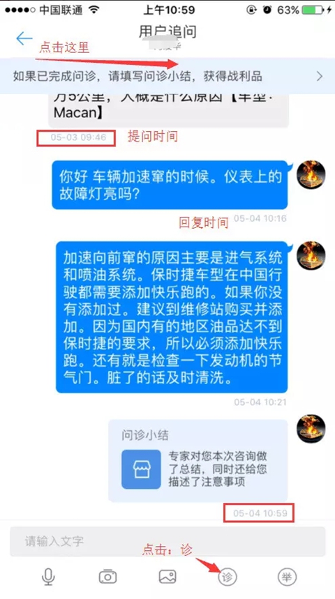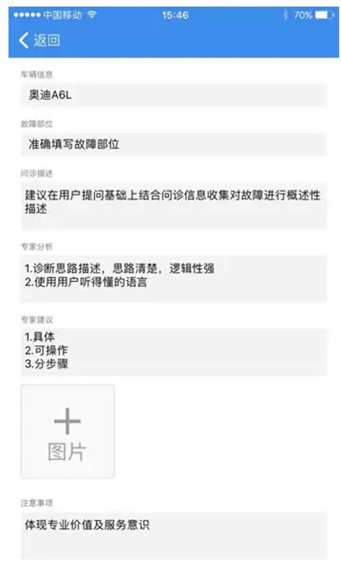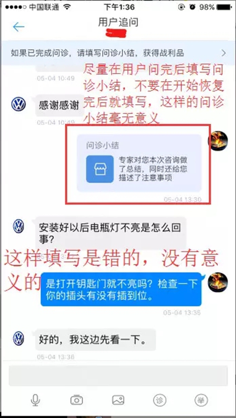问诊小结:相当于车辆进厂维修时候开的工单,到医院看病医生给病人写的病例,它是我们对于用户问题的一个简单,明了的总结。一个好的问诊小结体现了汽车大师平台里面的技师优质的技术水平和服务态度。