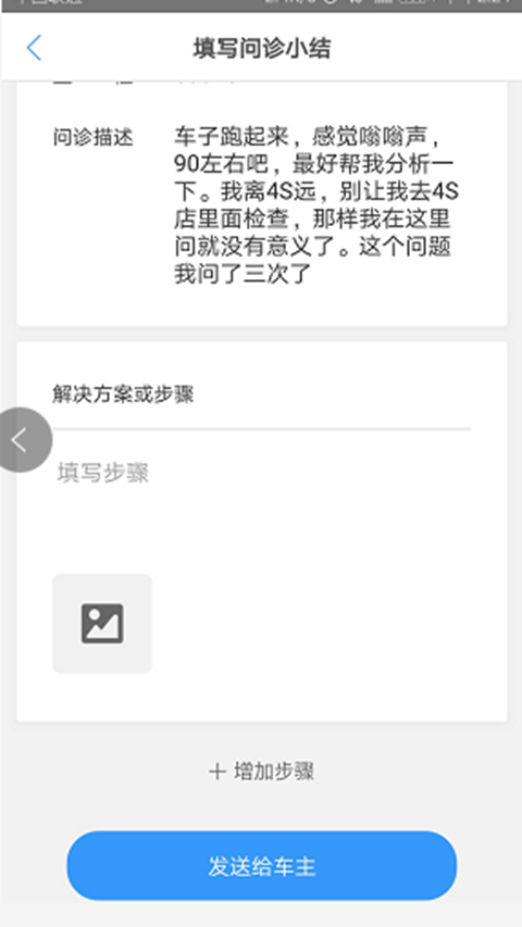 编写完成后直接就可以发送给车主了,如果觉得问诊小结有需要补充的,可以点击 “+增加步骤” 按钮进行添加。但是要了解的是先问诊,再填写问诊小结!需要注意的是,问诊小结要在问题关闭后24小时填写才有效哦!