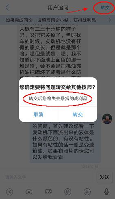 然后根据系统提示进行问题转交,如果一对一问题转交次数太多系统会强制关闭技师的图文咨询功能,并且限制技师回复付费问题的次数。