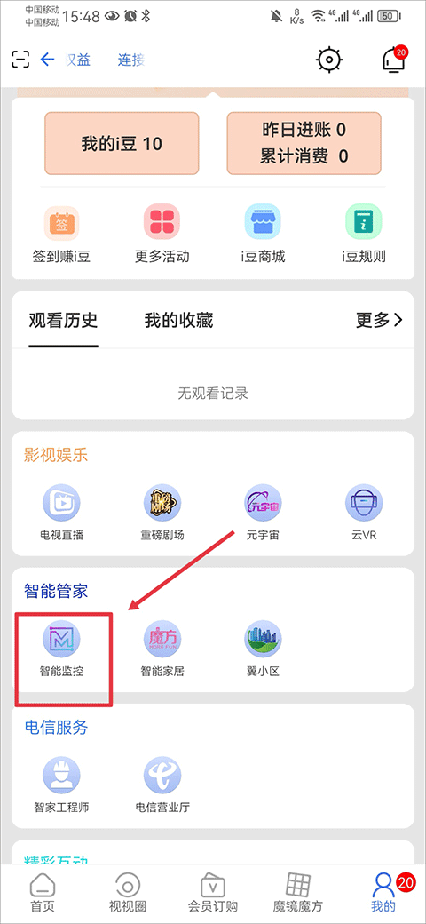一、打开i视app,在魔镜魔方界面中点击智能监控