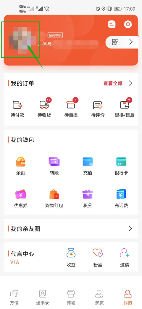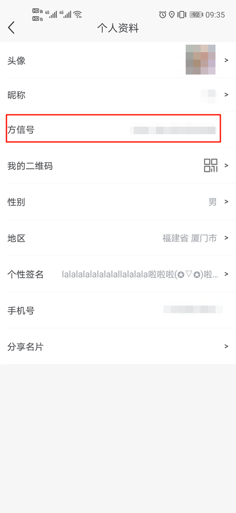 2、在“我的”页面中,点击顶部的头像区域,进入个人信息详情页,这里就可以查看到你的方信号了。