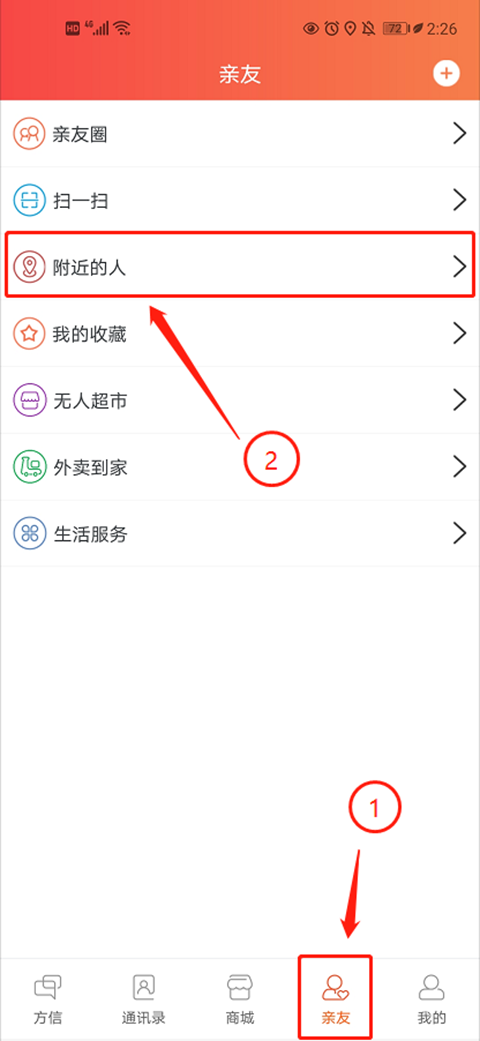 1、打开应用,在“亲友”模块中找到并点击“附近的人”,即可进入该功能页面。