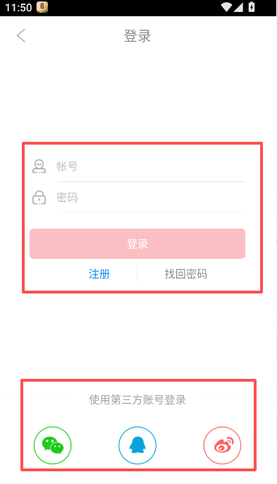 3、注册登录账号,或是使用第三方的社交平台账号登录进入。