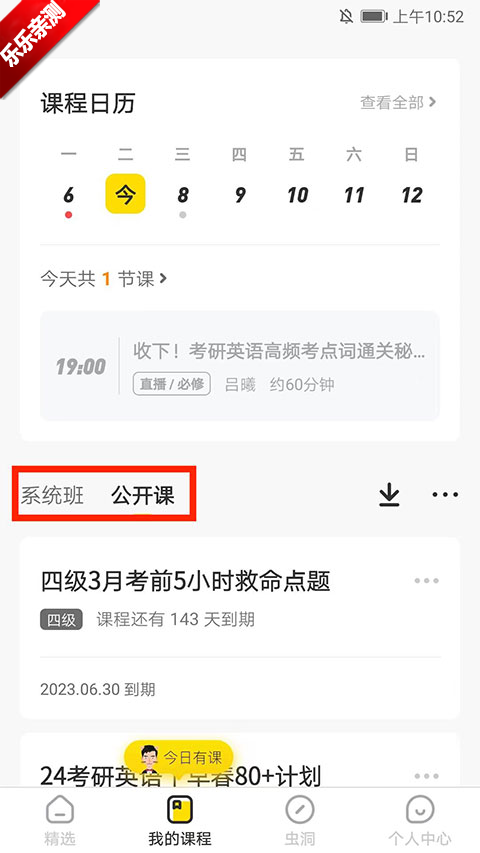 2、进入课程中心界面,分为“系统班”和“公开课”栏目,