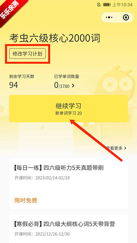 4、进入选择单词类型界面,“修改学习计划”可以修改单词类型,选择“继续学习”选项,