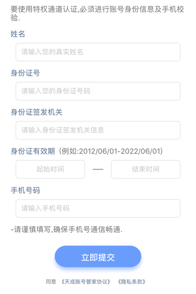 确保您已下载“天成管家”,打开“天成账号管家”APP,点击“特权通道”,进入认证界面。