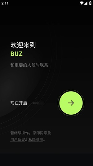 1、打开BUZ语音社交app,点击现在开启右侧的箭头