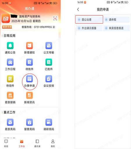 1、发起申请:省内党政机关事业单位公务人员因一般性公务外出时,需登录“湘办通”APP——办事申请——因公出差。