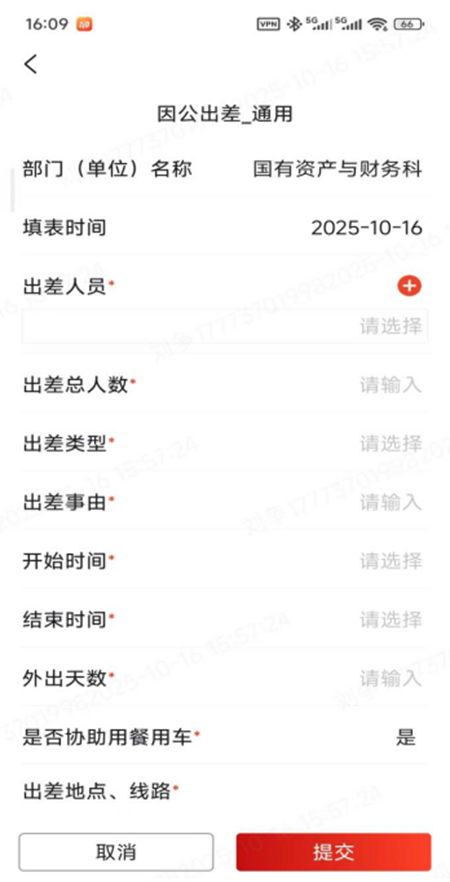 2、在线填写并提交差旅申请。申请内容需包含:差旅时间、差旅地点、参与人员信息、是否需要协助用餐(或协助用车)。