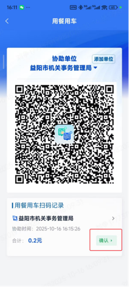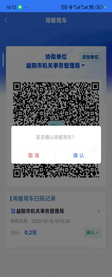 2、扫码查验与信息录入:协助接待人员点击“湘办通”平台APP右上角扫描功能图标,扫描出差人员出示的二维码,完成信息查验。查验通过后,接待人员需在平台内准确录入本次协助用餐(或协助用车)的具体信息和费用。