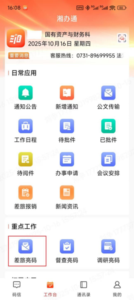 1、 亮码操作:出差人员在需要使用协助用餐或协助用车服务时,需打开“湘办通”APP平台——差旅亮码,找到本次公务活动对应的激活二维码,向协助接待人员出示该二维码。